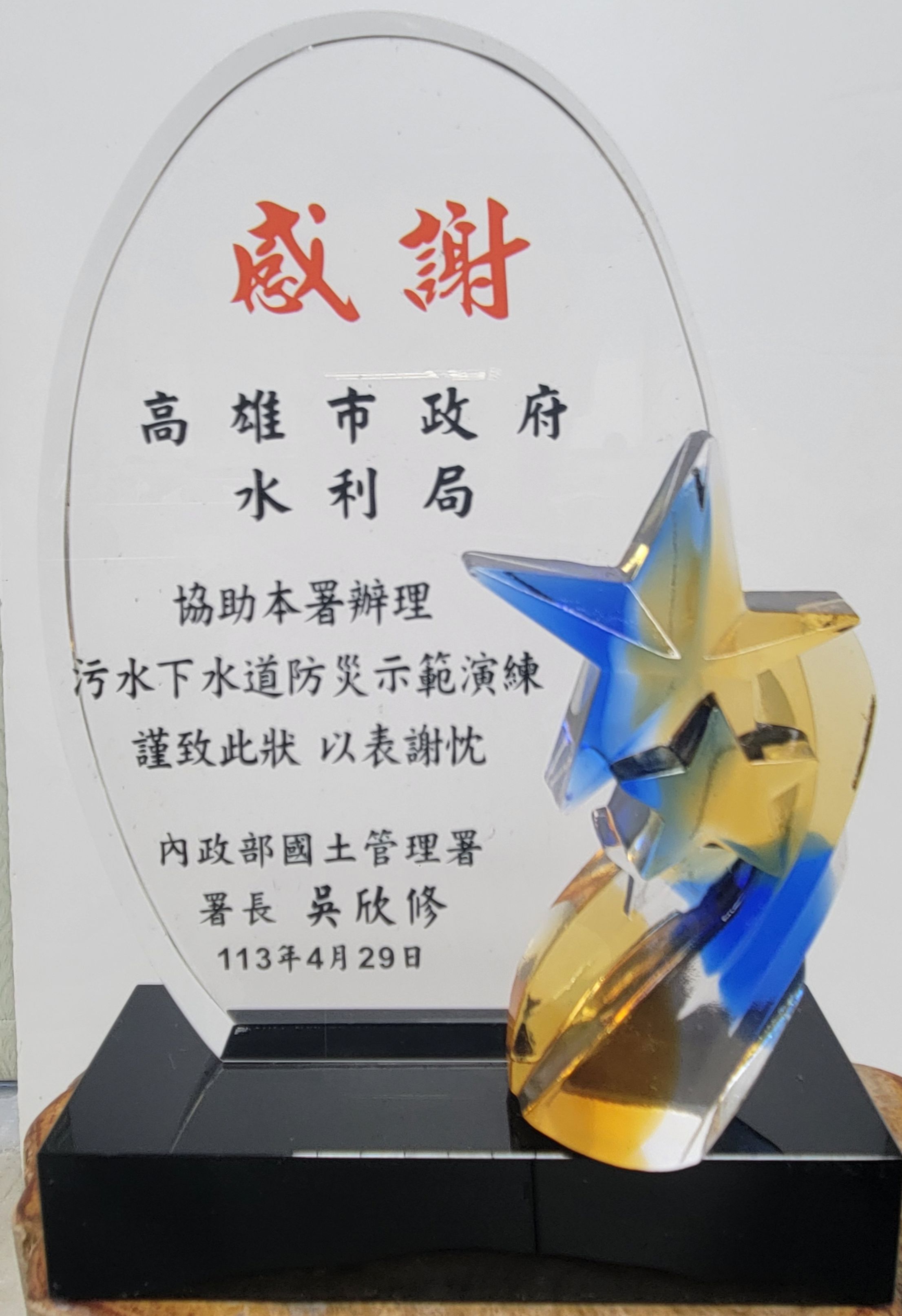 感謝獎盃113年度協助內政部國土管理署辦理污水下水道防災示範演練