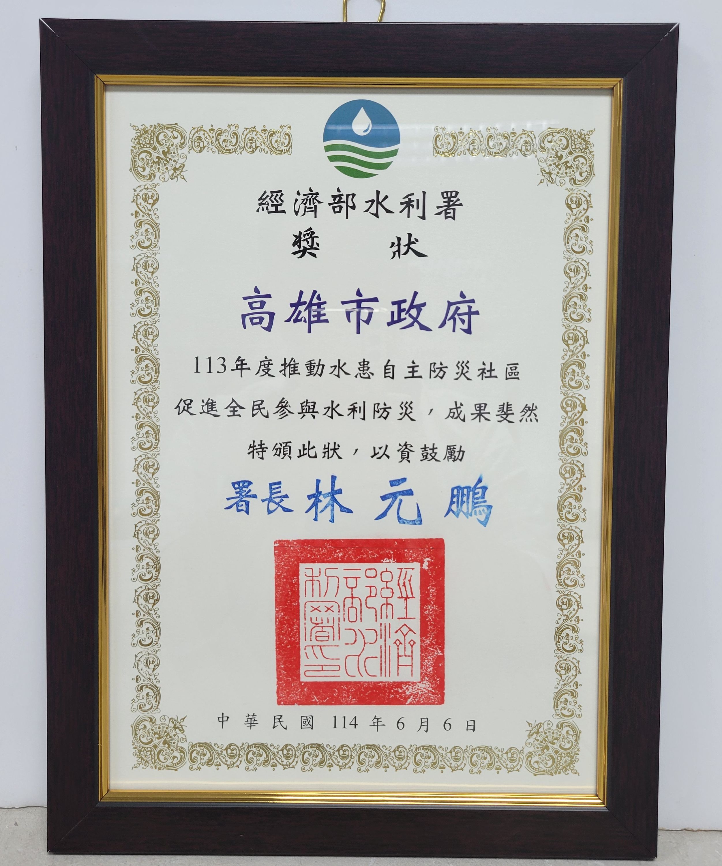 獎狀113年度推動水患自主防災社區促進全民參與水利防災成果斐然